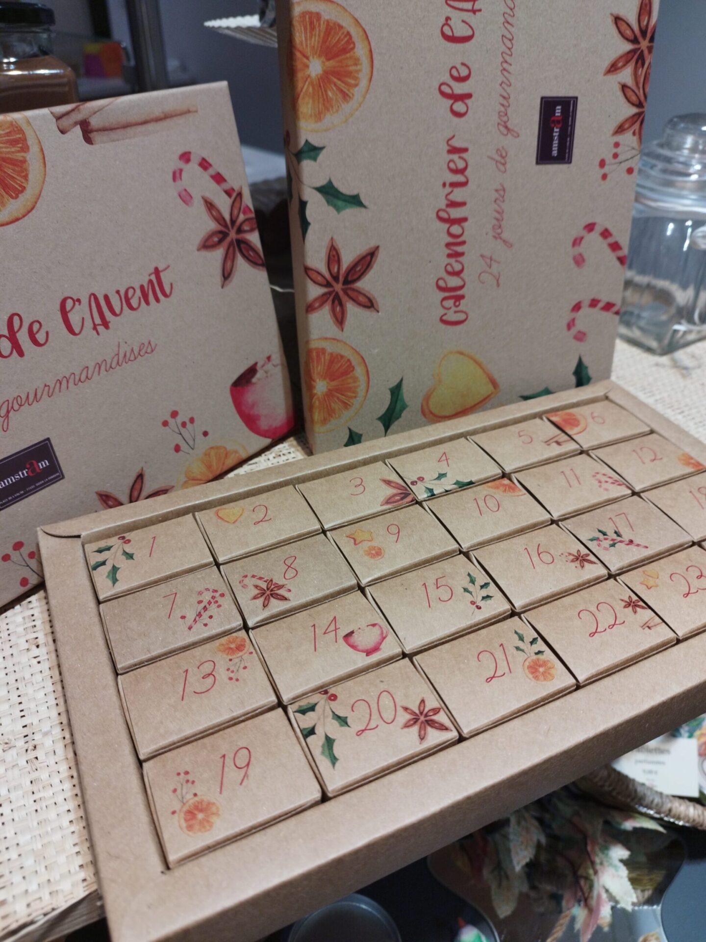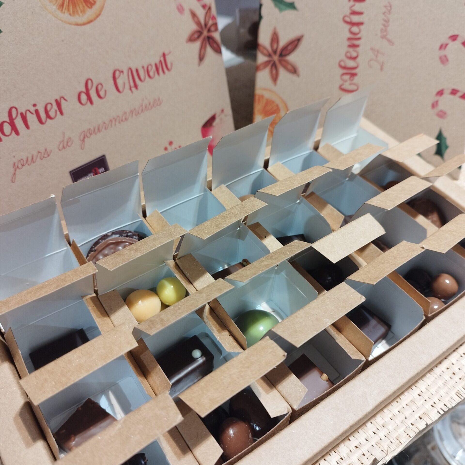 Ce calendrier est proposé pour être conservé et garni de nouveau l’année suivante. La composition: des chocolats assortis de la gamme : pralinés, ganaches, caramels, de palets fins de chocolat, des amandes, noisettes, billes de céréales et cacahuètes enrobés de chocolat.