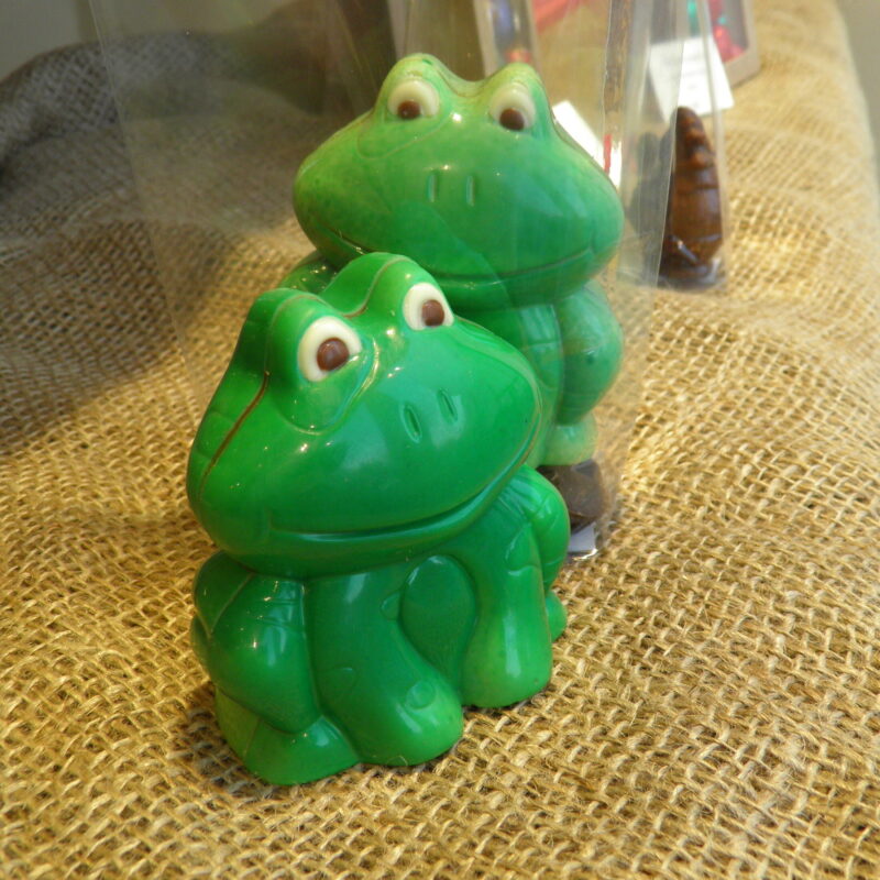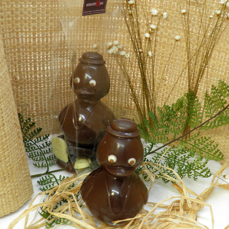 Sujet de Pâques en chocolat garni de friture en chocolat noir, lait et blanc.