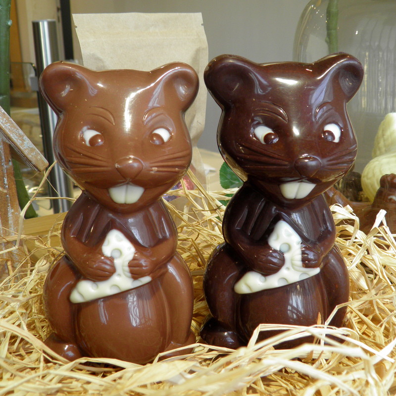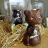 Sujet de Pâques en chocolat garni de friture en chocolat noir, lait et blanc.